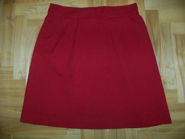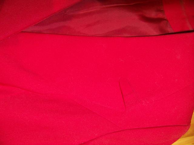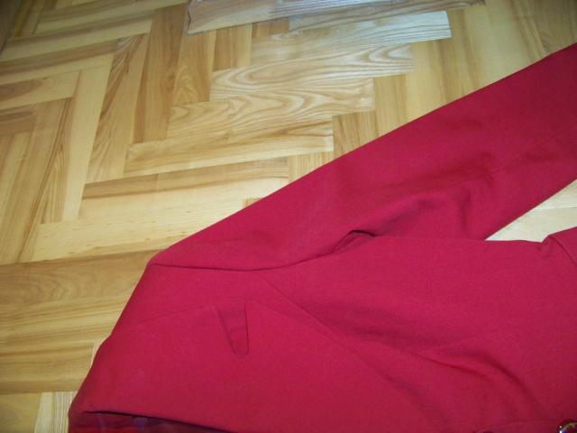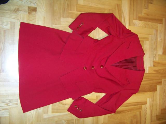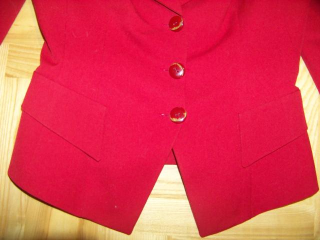 Originalus ryškiai raudonos kostiuminės medžiagos siūtas kostiumėlis su pamušalu. Sijonas trumpas, trapecijos formos, švarkelis iliemenuotas su dideliais originaliais atlapais. + pašto išlaidos