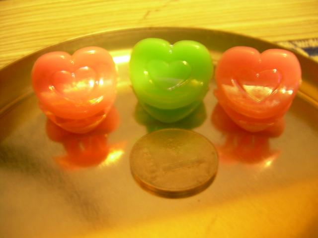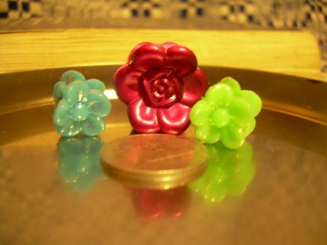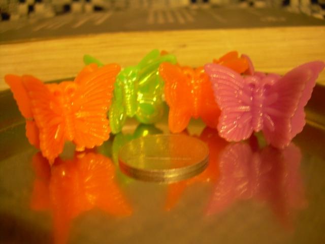 4drugeliai(2oranziniai, rozinis, zalias), 3sirdutes (2rozines ir zalia), 3 gelytes (zalia, melyna ir alyvine)