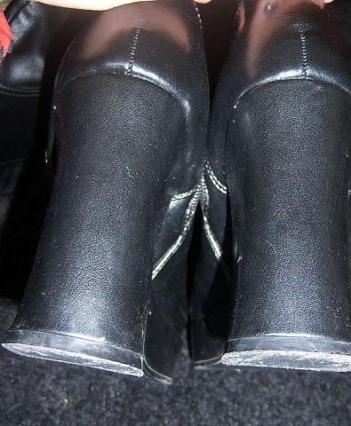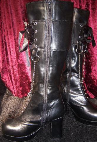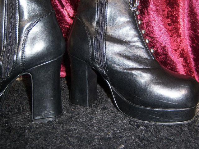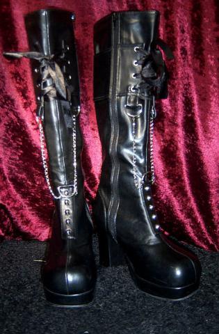 Batai atvežti iš Anglijos, labai geros būklės, dėvėti vos porą kartų. Dydis 38-39 (8 angliškas). Batų aukštis 47 cm, kulno aukštis iš nugaros 10 cm, platformos 2,5 cm. Plotis bato viršuje 36 cm. Iš vidinės pusės ant kulnų ir batų apačios yra nedideli nubrozdinimai, parodyta nuotraukoje