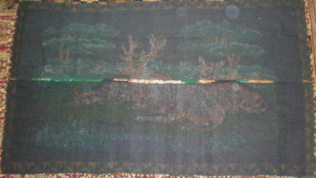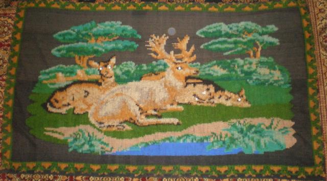 Didelis senovinis sienos kilimas su briedziu ir stirnomis