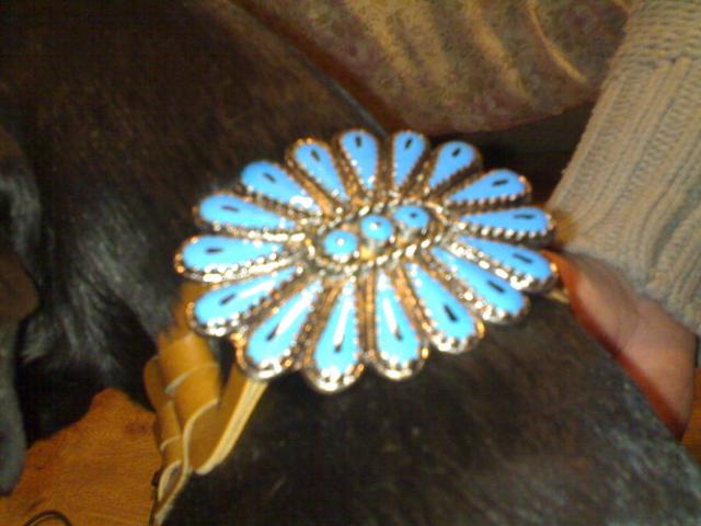 Odinis rusvas dekoratyvinis diržas, sunertas iš juostelių, surišamas šone. Sagtis metalinė, dengta turkio spalvos emaliu. Šunį papuošiau tik nuotraukai ;)