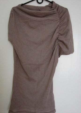 Drabužis pirktas jau seniai, bet nešiotas vos porą kartų. Tikrai įdomaus kirpimo: viena rankovė trumpa, o kita iki alkūnės, ją puošia dailus paraukimas(matosi nuotraukoje). Ilgis: dengia sėdmenis.