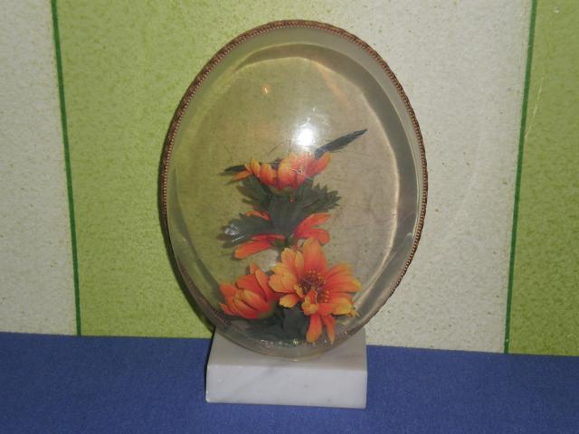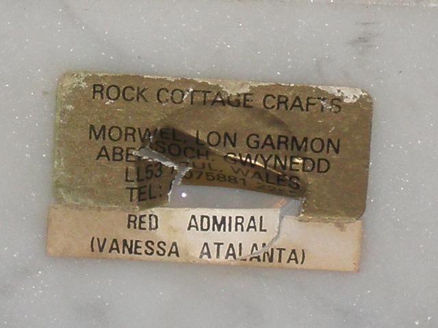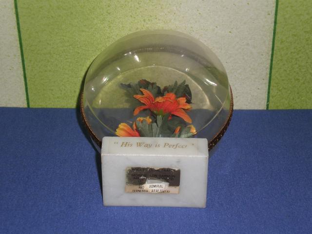 Drugelis (raudonasis admirolas) ant geles kiausinyje ant marmurinio pagrindo