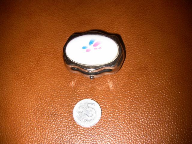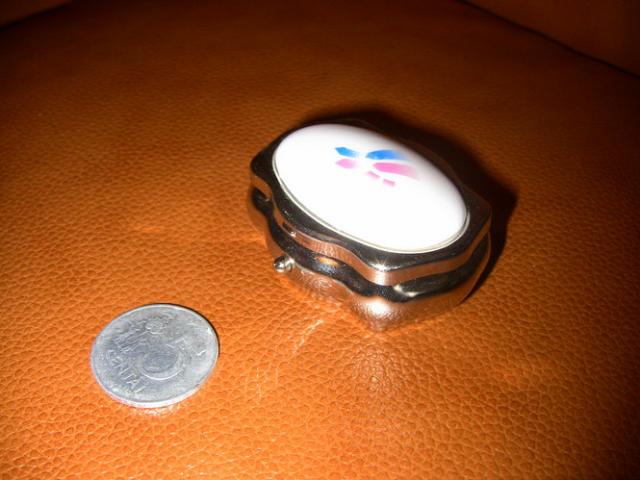 Metalinė dekoratyvinė dėžutė. Ant viršaus baltos keramikos papuošimas.
