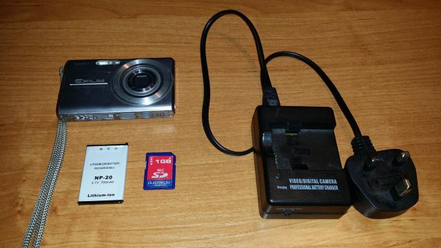 Paprastas fotoaparatas, 7,2 megapixelio. baterijos pakrovėjas išanglijos. yra 1 GB korta.