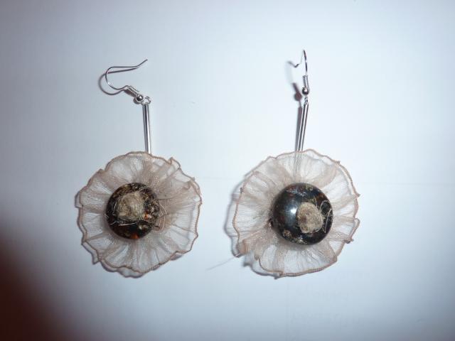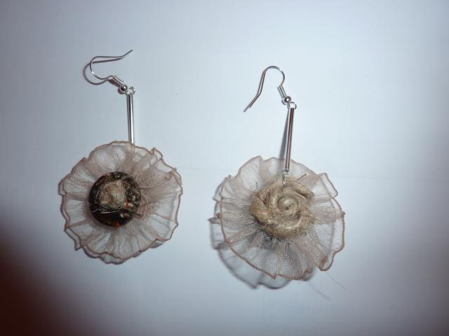 Rankų darbo auskarai gintaras+linas+medžiaga