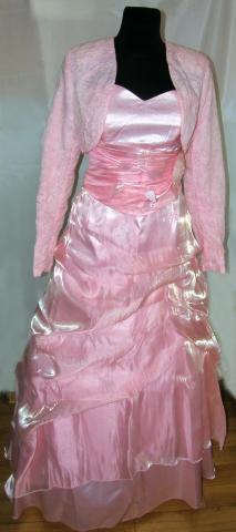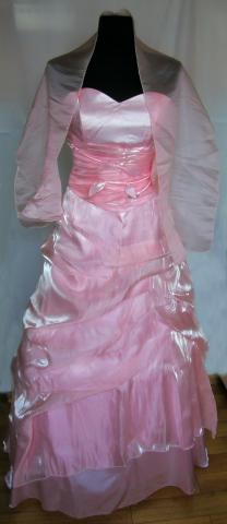 Ilga ružava suknelė (korsetas ir sijonas su pasijoniu). Prie suknelės yra dar skara ir švarkelis. Vieną kartą dėvėta.
