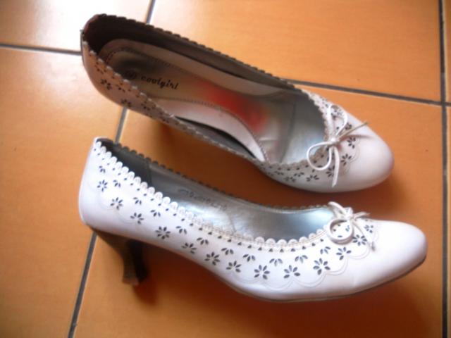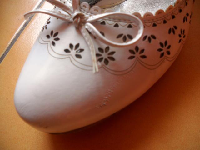 Gražučiai balti bateliai, su gražiais raštais šonuose, buvau užsidėjusi porą kartų, yra keli defektai, bet vos matomi, didžiausias matosi nuotraukoje. Išmera rašo, kad 40, bet atitinka 39 :)