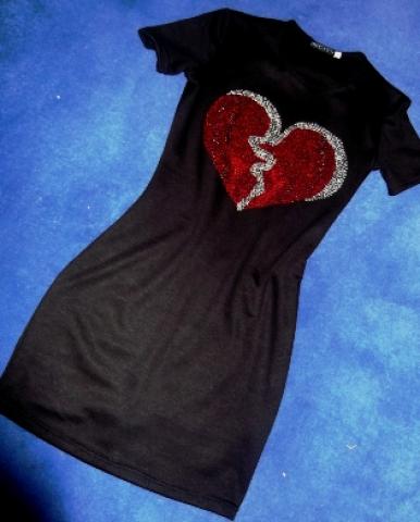 Nuostabi trikotazine suknele - Cyvenchy style- priekyje sirdeles formos aplikacija - is blizganciu akmenuku, nugaroje - sirdeles formos iskirpte. Medziaga - tampri, svelnus trikotazas, dydis S, S/M