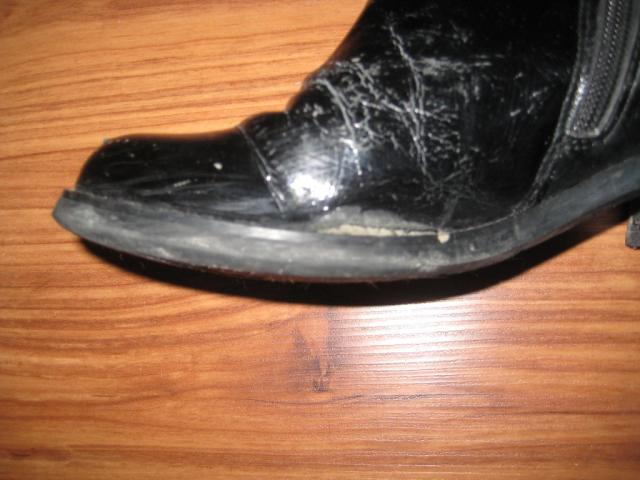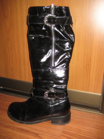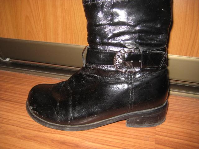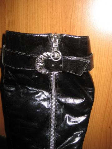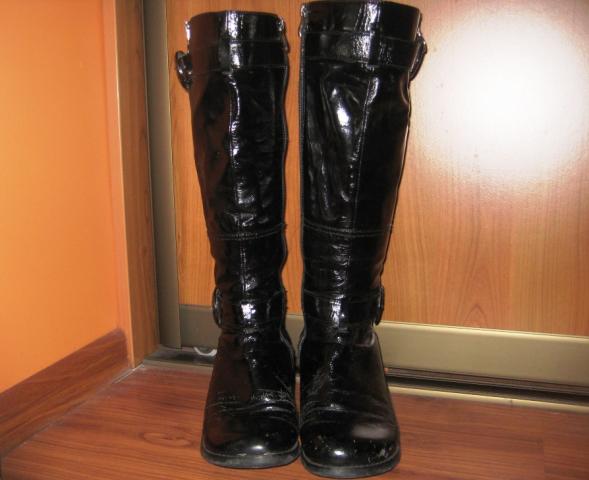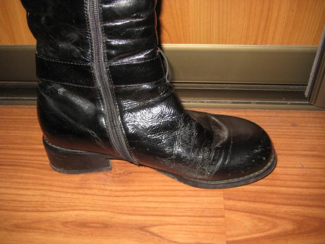 Batai naturalios odos, lakuoti, su naturaliu kailiu labai patogūs. Nemažai panešioti. Kulnas naujai pakaltas, padas tvirtas. Yra defektas - horizontalus įplyšimas palei padą. Pažįstu meistrą, kuris labai gražiai šį defektą taiso. Pati nenešiau taisyti, nes neketinu šių batų avėti. Pasidarė persiauri per aulą :(