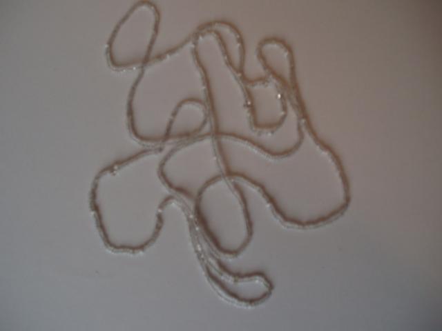 is mazu, skaidriu, baltu karoliuku; ant rankos arba ant kaklo