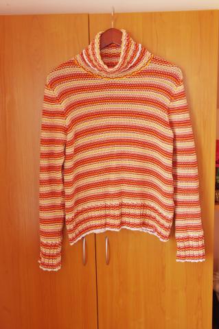 Oranžinės spalvos, dryžuotas megztukas. Tinka smulkiai merginai - S/SX dydis. Šiek tiek apsmunka. Šiltas.