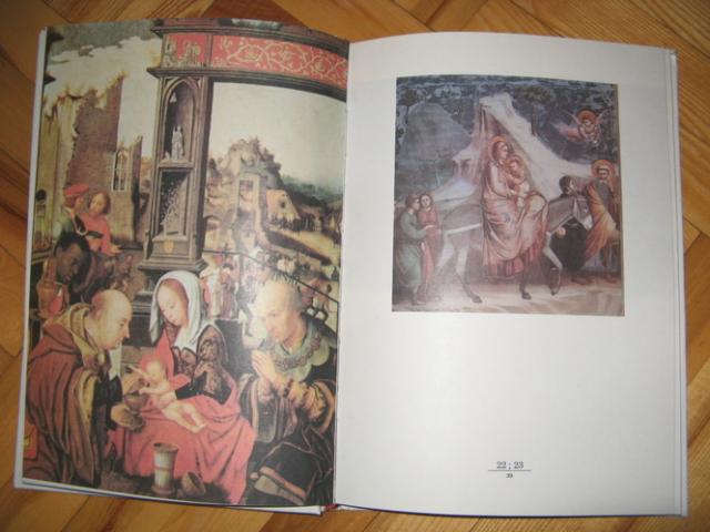 yra įžanginis žodis keliomis kalbomis (iskaitant lietuviu), o toliau vien paveikslai biblinių siužetų ivairiu saliu dailininku (pvz. van Eyck, Botticelli, Lochner, Raphael ir etc), o gale yra paveikslu rodykle, kurioje parasyta kas nutape, kada, pava