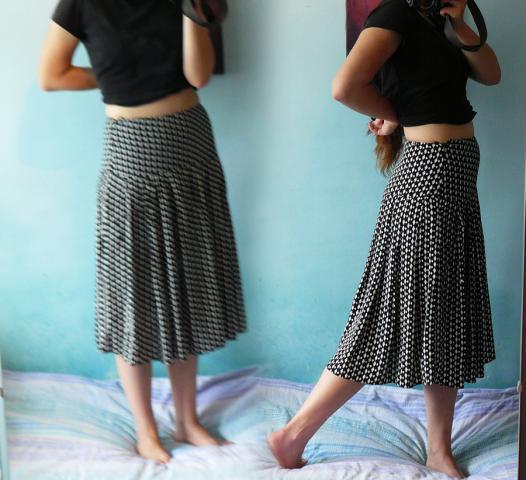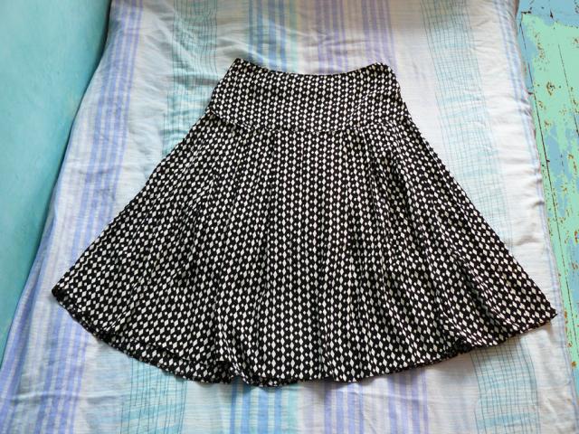 Kaip matot, tai ne mano dydis, vos įsivilkau nuotraukom :). Žiauriai fainas sijonas, lengvutis, malonus, pagamintas Lietuvoje iš 100% viskozės, su pamušalu, turi tik vieną mažą broką, kurį matote 5 nuotraukoje, mažytę raudoną dėmelę, bet ji pradingsta tokiam plačiam sijone, tikrai ;) Juosmuo 70cm, klubai 90cm, ilgis 65cm.
