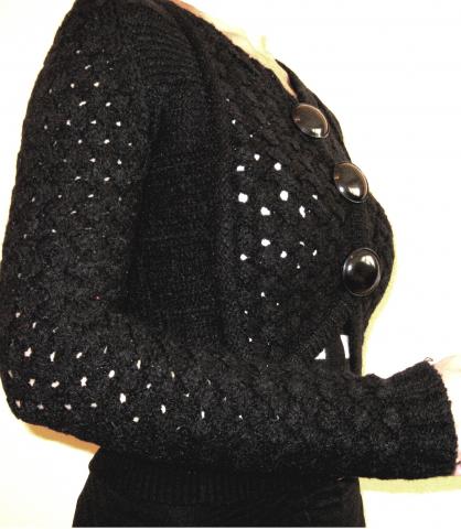 Juodas, megztas kiauraraščiu bolero. Užsegamas priekyje.