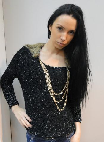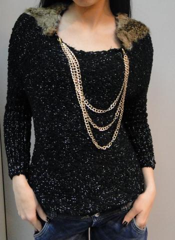 Juodas megztukas su blizguciu, kailiniais naturalaus triusio kailiukais. Grandineles nusiima. Universalus dydis.