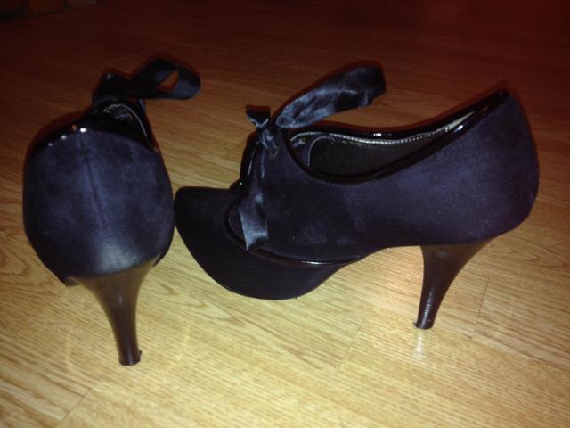 Juodi dirbtinio zomšo aukštakulniai bateliai su raišteliais (detalės ant raištelių sidabro spalvos). Kulno aukštis 10 cm, platforma 2,5 cm. Kulnas šiek tiek apibraižytas, taip pat reikėtų pakeisti kulniukų pakalimus. Kaina nurodyta su siuntimu, atsiimant Klaipėdoje - bus nuolaida. Jeigu reikia papildomos informacijos - rašykite, atsakysiu :)