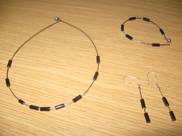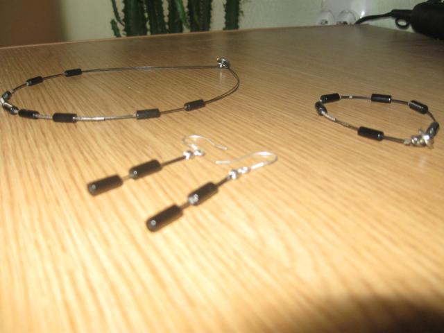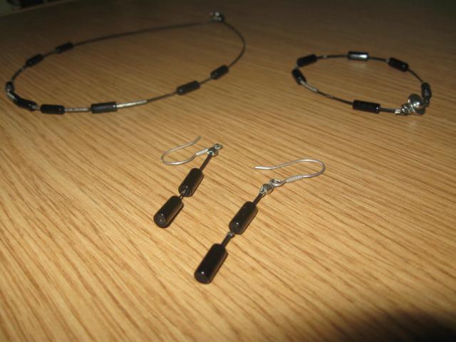 Naujas, nei karto nenešiotas. Rinkinyje kaklo papuošalas, apyrankė ir auskarai. Iš juodojo gintaro