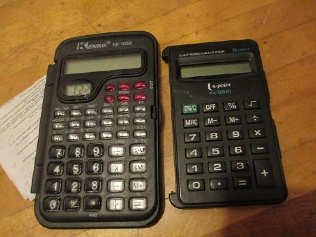 Atiduodu dvi skaičiavimo mašinėles (galima paimti ir kartu ir atskirai). Viena yra paprasta standartinė, kita - "Kenko" įmonės skirta aukštajai matematikai; su ja galima skaičiuoti logaritmus, trigonometrines funkcijas, kelti bet kokiu laipsniu ir t.t. Kartu su šia skaičiavimo mašinėle pridedu ir instrukcijas. Abu kalkuliatoriai yra geri, nenusitrynę, tačiau abiejų yra išlūžę vyriai ir jie neturi apsauginio dangtelio.