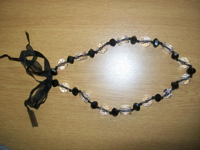 Bespalviai karoliai suverti anr juodos virvelės, ilgį galima reguliuoti. Nešiojau kartą.