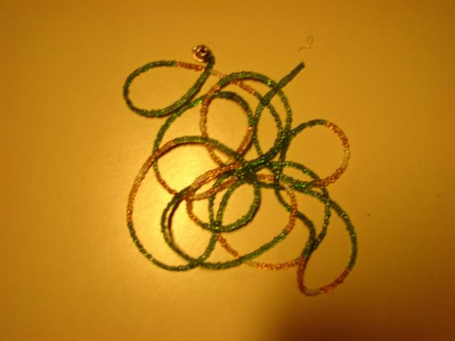 Smulkūs karoliukai. Žali, geltonai auksiniai ar kažkas panašaus, balti.