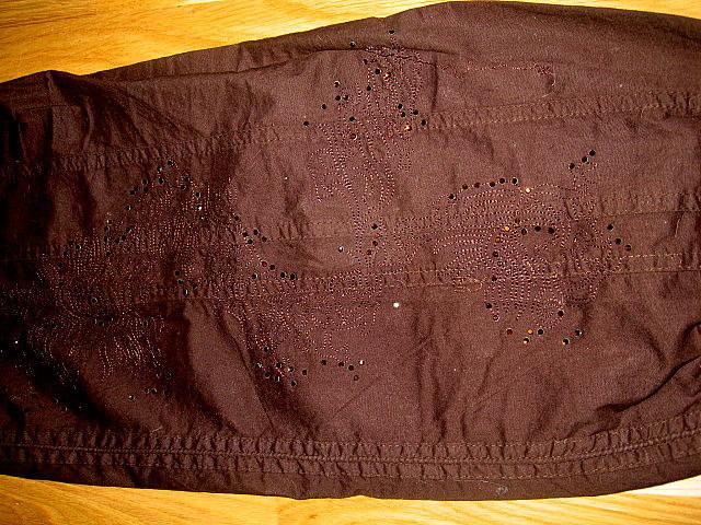 labai plona medziaga.ypatingos tuo,kad ant dešnės klešnės iki kelių išsiuvinėtas raštas ir puoštas swarowskiais rudais,todėl nerealiai atrodo vakare lempų šviesoje.s/xs