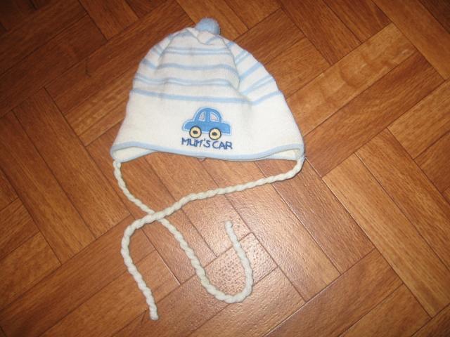 Balta su žydra berniukiška kepurė, tinkanti mazdaug kūdikiui 5 mėn.
