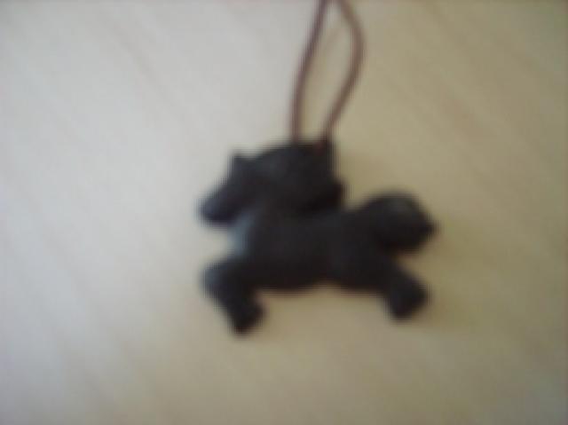 juodas, keramikinis pakabukas ant kaklo, arkliukas. Iš Arklio muziejaus