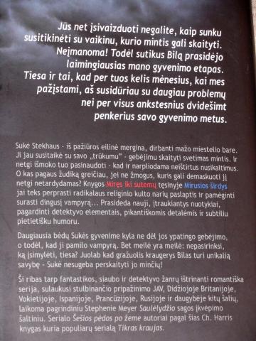 Charlaine Harris - 'Mirusios širdys'. 2009 metai. Kietas viršelis. 368 puslapiai. Dėl kainos ar daiktų mainų galime derėtis. Tai antroji knyga iš romanų serijos apie vampyrus, kurios pagrindinė veikėja - Sukė Stekhaus. Ši iš pažiūros eilinė mergina, dirbanti mažo miestelio bare, jau susitaikė su savo „trūkumu", sugebėjimu skaityti svetimas mintis, ir netgi išmoko juo pasinaudoti. Knygoje „Mirusios širdys" jai teks perkąsti radikalaus religinio kulto narių smegenis ir pamėginti surasti dingusį vampyrą.