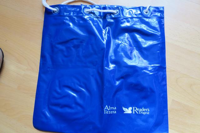 Nauja knygų nešioklė. Puikiai tinka neštis į paplūdimį, ten tikrai nesušlaps, nepasimes ar neišsipurvins knygutės. :) Pati turiu dar vieną tokį, praverčia labai. Gan didelis.