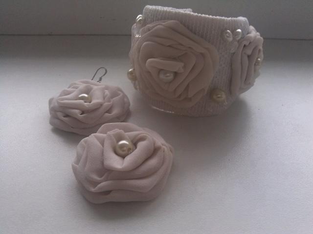 Rankų darbo apyrankė su auskarais iš audinio ir karoliukų