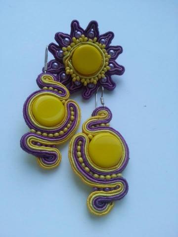 Rankų darbo sagė su auskarais iš sutažo juostelės ir karoliukų