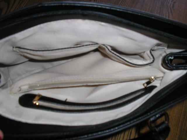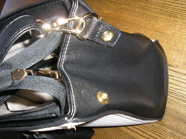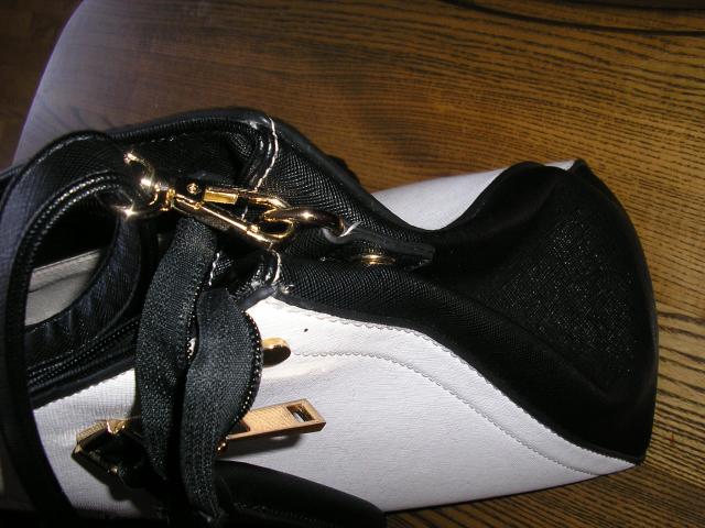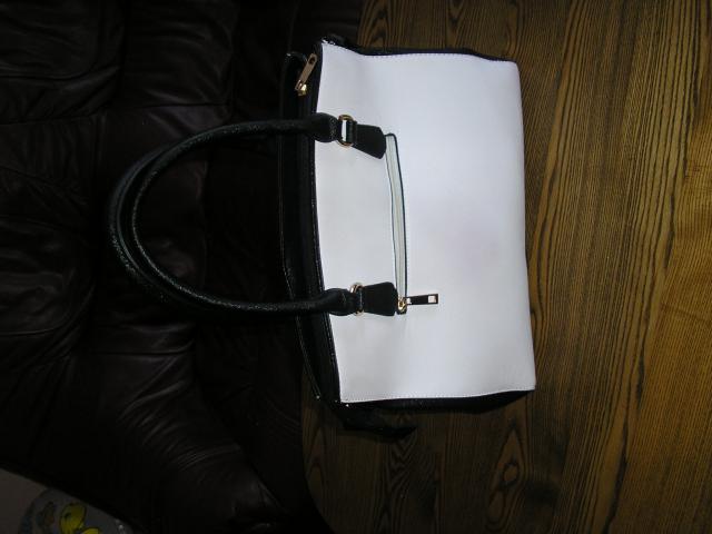 Labai grazus rankinukas (rankine). Baltas su juoda. Dydis aukstis 26cm, plotis 34,5cm, gylis 12cm. apacioje metalines - kojeles. Galima nesioti ir per peti yra ilga rankena. Sonai susegami, arba galima atsegti ir padidinti.