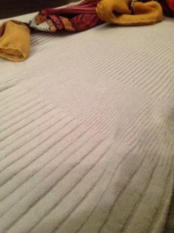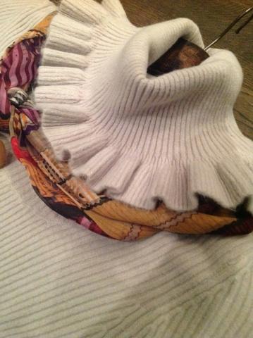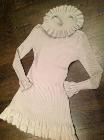 Šviesiai pilkos spalvos (beveik balta) labai šiltos medžiagos suknelė. Švelni, maloni prie kūno medžiaga, sudėtyje yra lanos vilnos. Patus kaklas. Devėta, be defektų. Išmatavimai: pečiai 37, krūtinė 37, liemuo 31, klubai 43, visas ilgis 76. Dėvint tempiasi į visas puses po 6-10 cm. Tiktų panelėms dėvinčioms 34-36 dydį. Sudėtis: 70 acrylic, 25 lana wool, 5 nylon. Skarelė neparduodama.