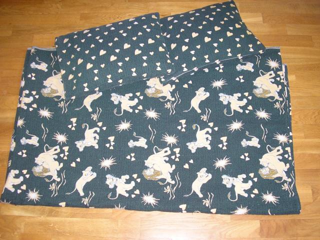 Lovos uztiesalas (Lovatiese) + du pagalviu uzvelkaliukai su "Liutu karalium" . Medziaga tamsiai zalia su gelsva (sviesiai ruda). Dydis 136x215cm. Pagalveles uzvelkalai 2vnt. 32x43cm