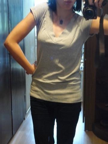 Ilga, pilkos spalvos maikė. Nugara tokio pat kirpimo kaip ir priekis