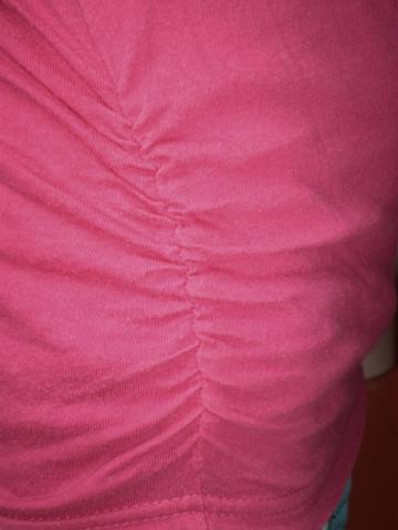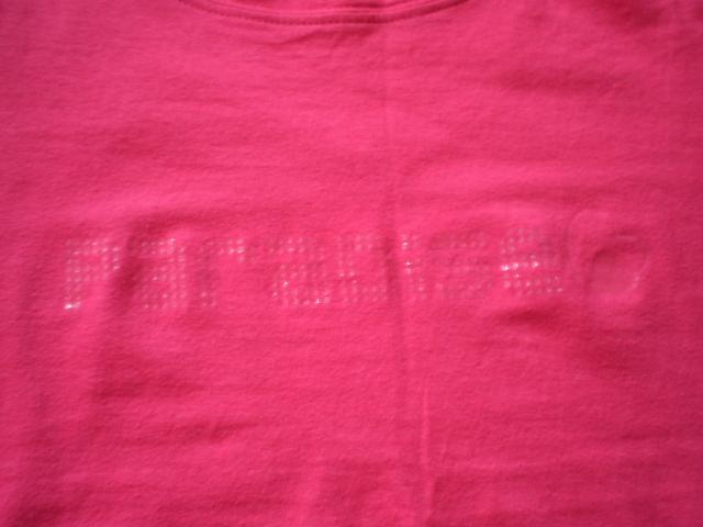 Rožinė, šonuose gražiai paraukta. Iš blizgučių priekyje sudėtas užrašas "paradise". Ilgis nuo iškirptės: ~48cm; nuo pečių: ~54cm; nuo pečių ištempus gumą: ~59cm; rankovytės: ~2x15cm (tamposi). Rašo, kad tinka ūgiui 146 - 152cm, mano ūgis 160cm ir man ji tinka :) Pirkta seppala parduotuvėje.