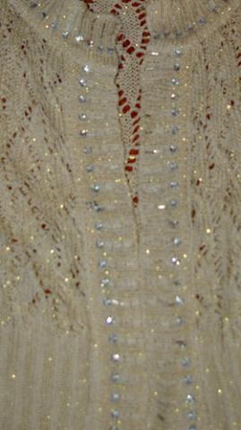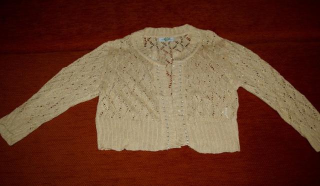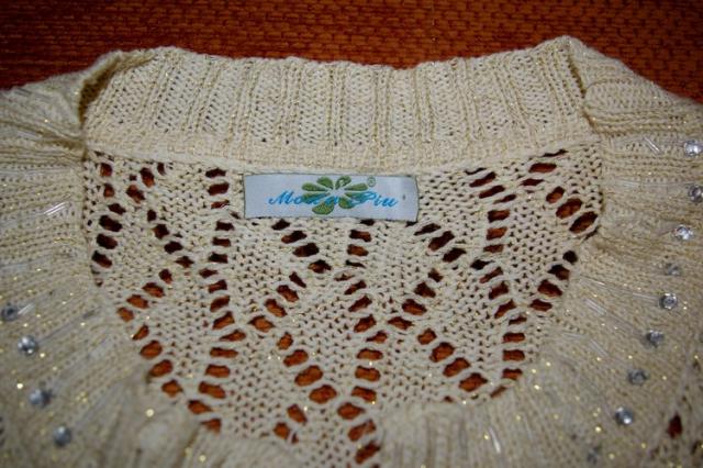 Megztas megztinukas, smėlio spalvos, turintis blizgesį, kur eina uzsegimas yra papuošimai. Tinka ir progai, ir kasdienai. Gražiai atrodo ir ant baltinukų, tinka ir ant suknelės kaip stiliaus detalė.