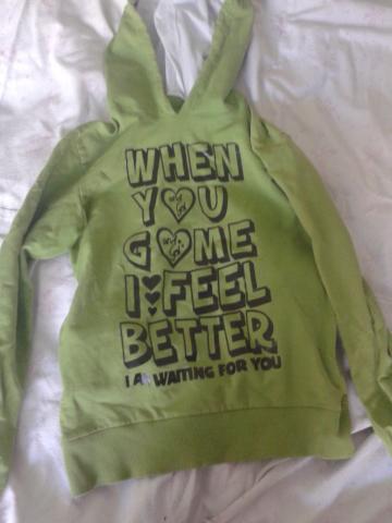 zalsvas megztinis su uzrasu vaikiuj 10 11 metu mergaitiskas. megztinis su kapisonu