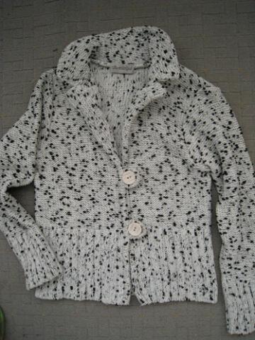 Mazai devetas toks baltas su juodais gumbeliais megztinukas, kazkiek primena svarkeli, uzsisega dviem sagom 36 dydis, nera ilgas, kazkur iki dirzo