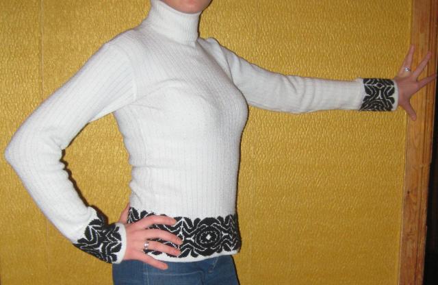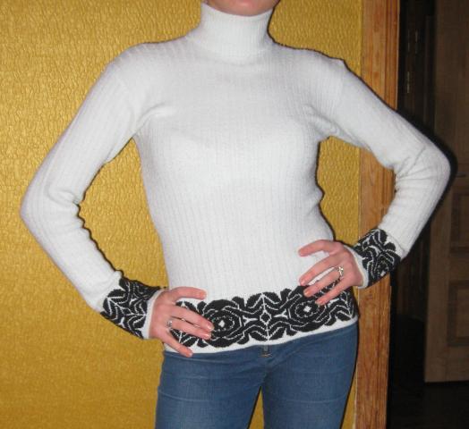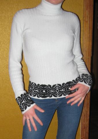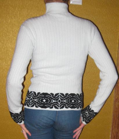 Simpatiškas megztukas aukštu kaklu, šviesiai žydros spalvos su juodais raštais. Dydis - S/M