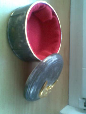 Metalinė dėžutė papuošalams. su gražiu menuliu ant dangtelio. sunki :)