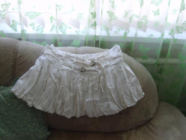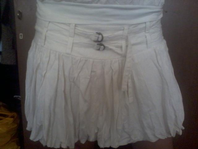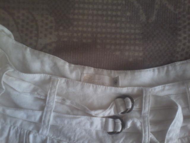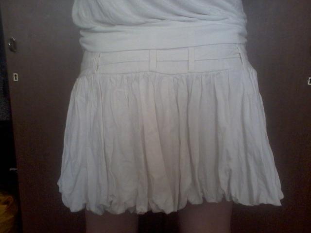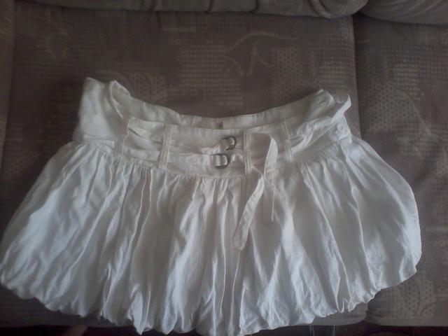 baltas sijonukas,vos pora kart devetas,o siuo metu didokas,tj taip ir stovi nenesiojamas.sijonas auksciau keliu,graziai krinta medziagyte ant kuno.yra dirziukas,kurio pagalba galima reguliuoti apimti,todel tiks tiek m dydziui ,tiek l.sone yra 3 sagutes,kuriomis uzsisega.sijonukas be defektu