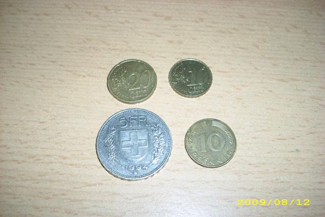 5 šveicariški frankai (1994), 10 vokiškų pfenigų (1991), 30 eurocentų (2002 ir 2003)
