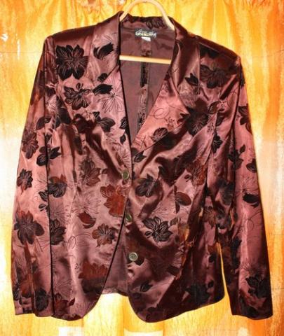 Rudas išeiginis švarkas su gėlių ornamentais. 54 dydis