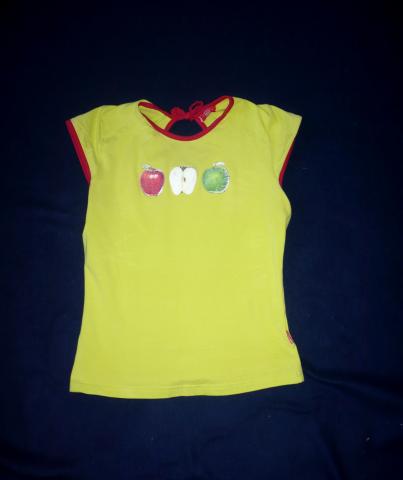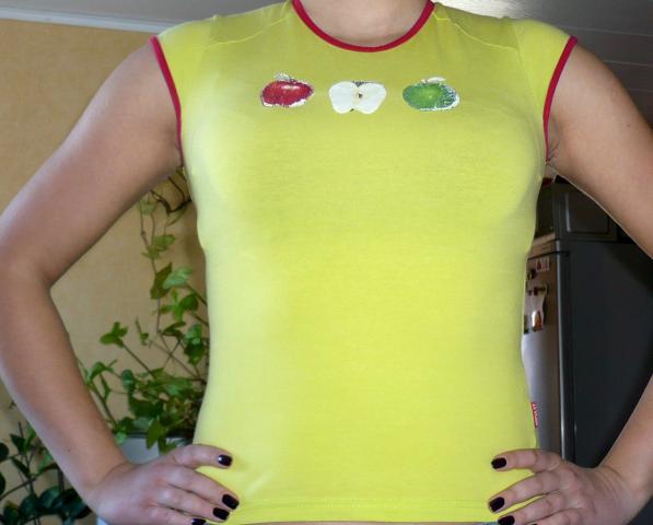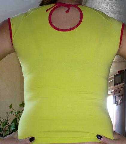Salotinės spalvos moteriški marškinėliai su raudonais kraštais, labai maloniai priglunda prie kūno. Priekyje yra 3 obuoliukai, nugaroje - apvali iškirptė surišama raišteliais viršuje.