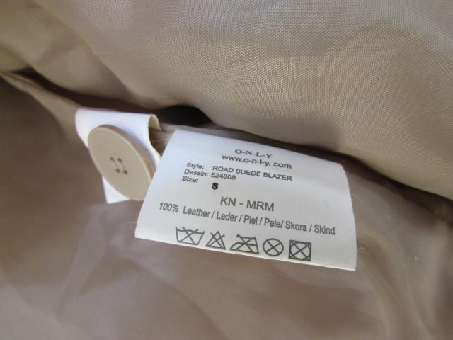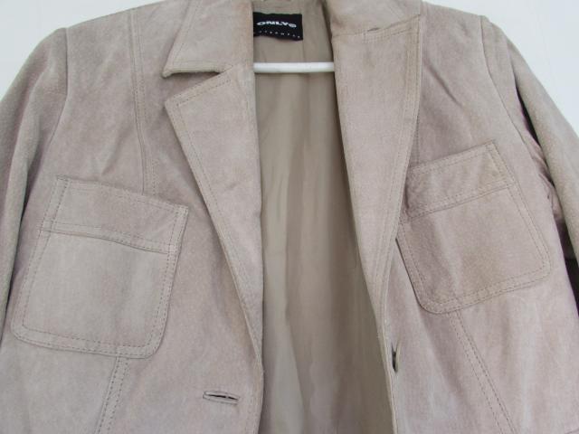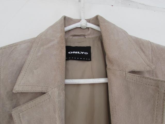 Natūralios švelnios odos ONLY švarkelis. Šviesiai balintos kakavinės spalvos (nuotraukoje dėl saulės netolygiai apsišvietė...). Reikėtų valyti, pasidevėję rankogaliai, buvo nešioti kiek įlenkus į vidų). Rankovės ilgis nuo peties siūlės iki galo - 66 cm.