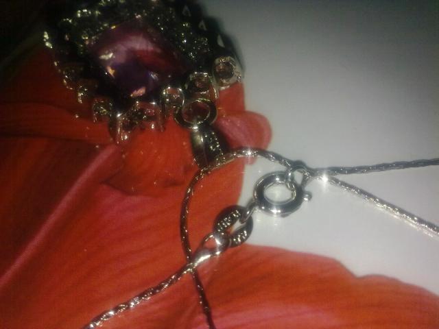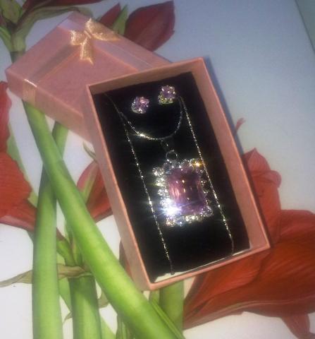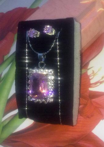 Naujas komplektas su ametistais + auskarai. Ant pakabuko yra 18 fianitų. Yra praba, dovanų dežutė. Kaina 70 Lt. Pakabukas: 2,5x2cm. Auskarai: 0,6x0,6cm. Grandinėlės ilgis 46cm. Tel.: 860560058