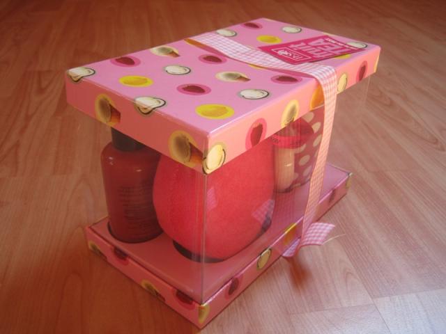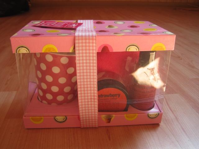 kempine, sveitiklis ir prausiklis, ar kremas, nebepamenu ;D bei puodelis :) jei domesites, paziuresiu kas tiksliai ten pakuoteje yra :)