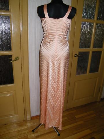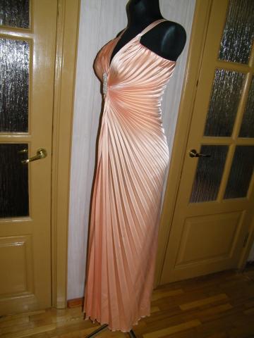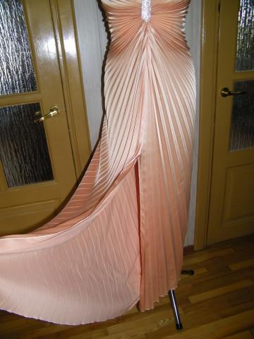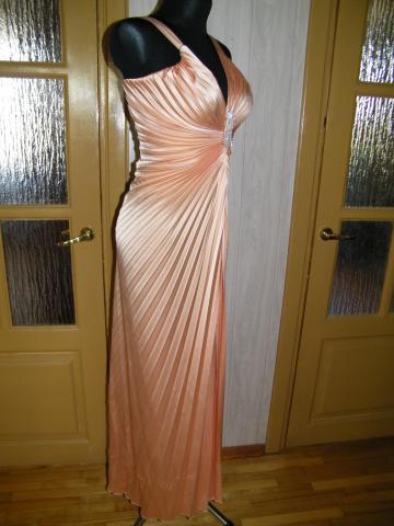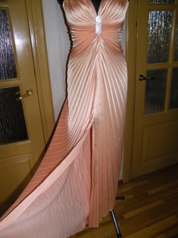 Išeiginė ilga persiko spalvos suknelė,parasyta 40 dydis,bet tinka 38.Sagtis priekije atsisega,krutinė 92 cm,ilgis 152 cm.Buvo dėveta viena kartą,išvalyta heminiu būdu.